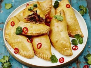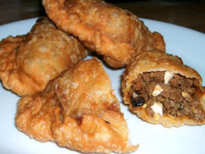 Empanadas are similar to cut-up pies and they’re typically filled with cod fish or chicken. An empanada is made by folding a disc of thinly rolled dough over the filling into a semicircle, then crimping the edges to seal it. The dough is often made with wheat flour, but this isn’t universal. The exact content of the dough can depend on whether the empanadas will be baked or fried.